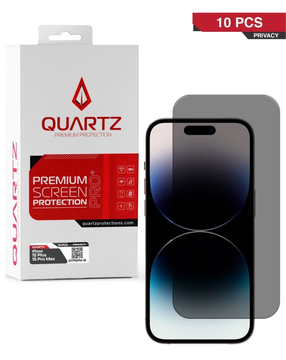 Purchase the QUARTZ Privacy Tempered Glass for iPhone 15 Plus and 15 Pro Max, pack of 10. QUARTZ Privacy Tempered Glass for iPhone 15 Plus / 15 Pro Max (Pack of 10)
