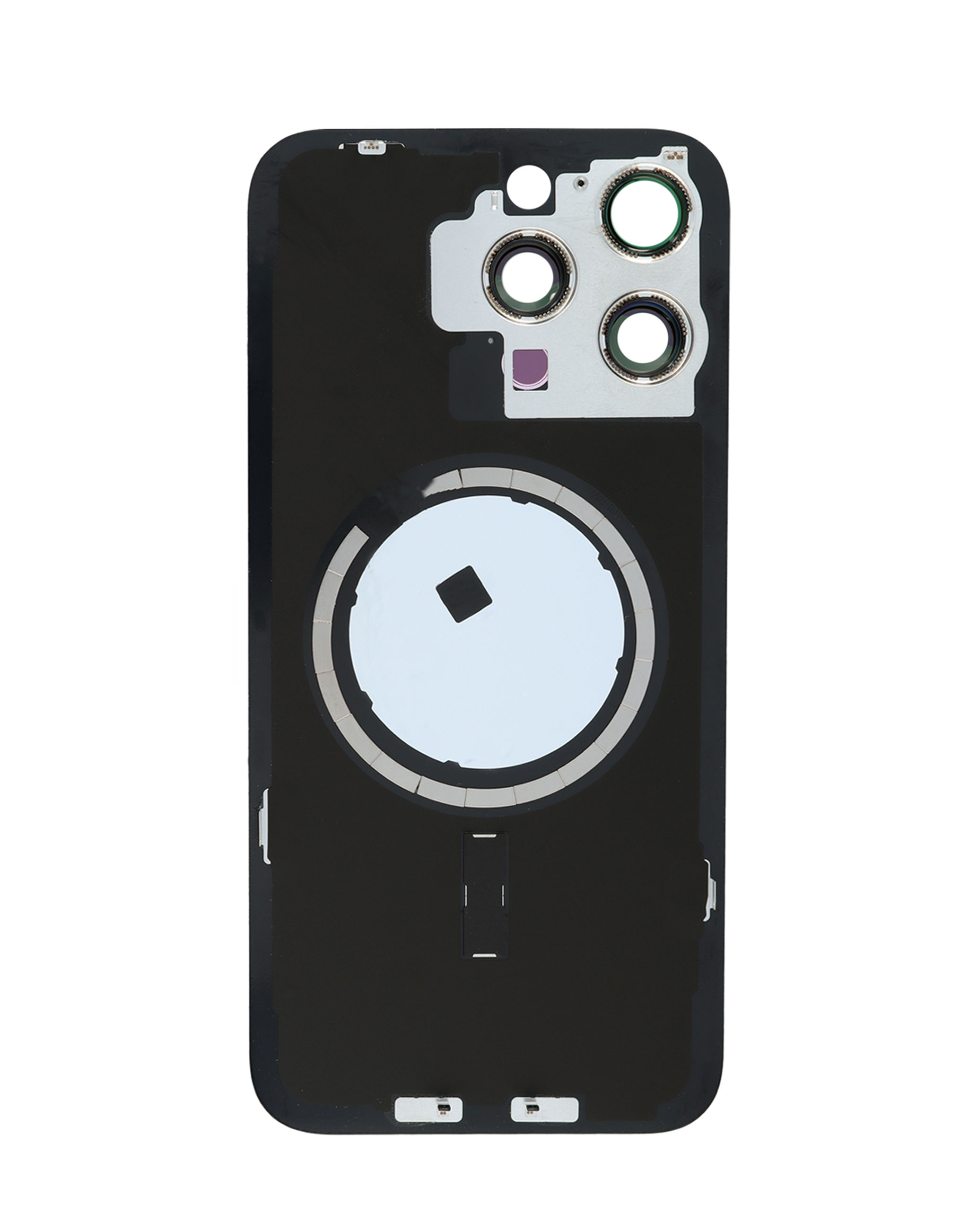 Product Color Badge Stock up on the back glass with frame and MagSafe magnet for iPhone 15 Pro Max in black titanium, no logo.