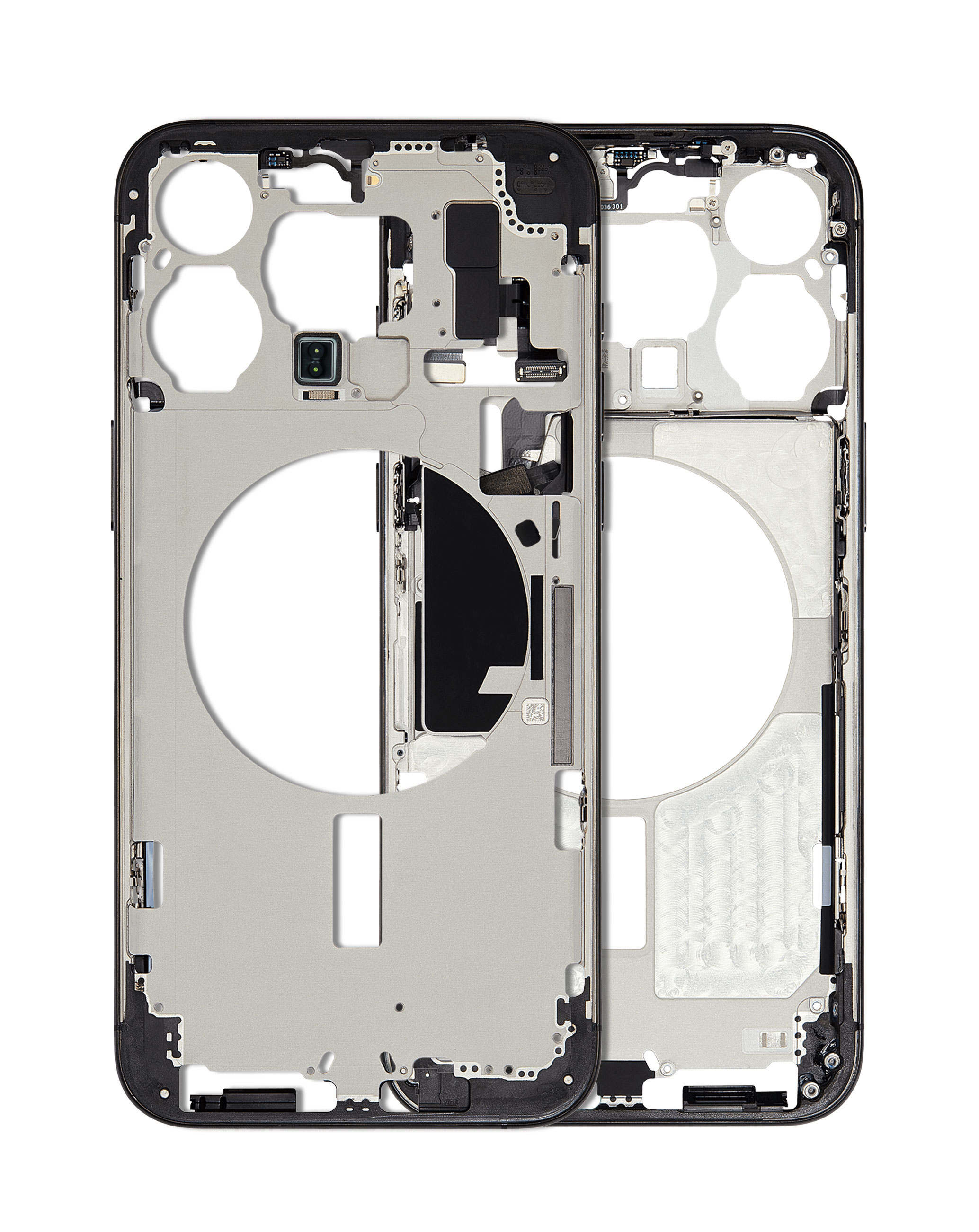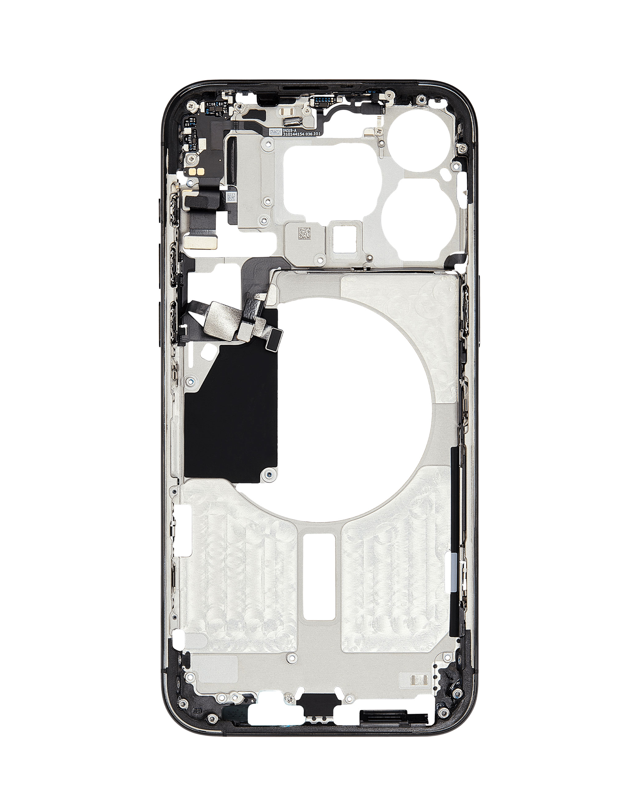 Order the Middle Frame with parts for iPhone 15 Pro Max in Black, International Version, OEM Pull B Grade. Middle Frame with Parts for iPhone 15 Pro Max (BLACK) (International Version) (OEM Pull B Grade)