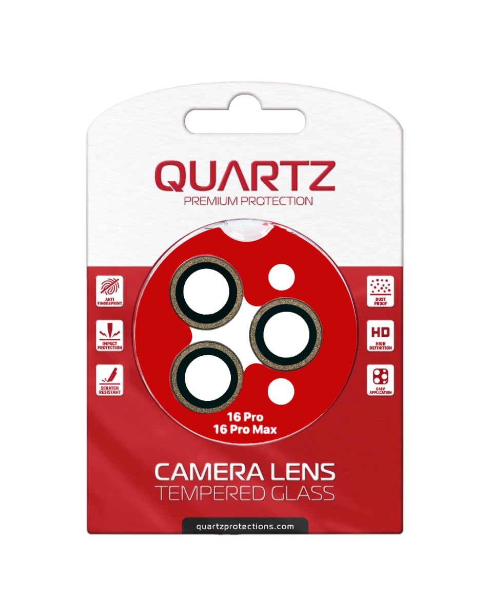 Shop the Quartz HD Tempered Glass in Gold with Glitter Diamond Camera Lens for iPhone 16 Pro and 16 Pro Max Back Camera.