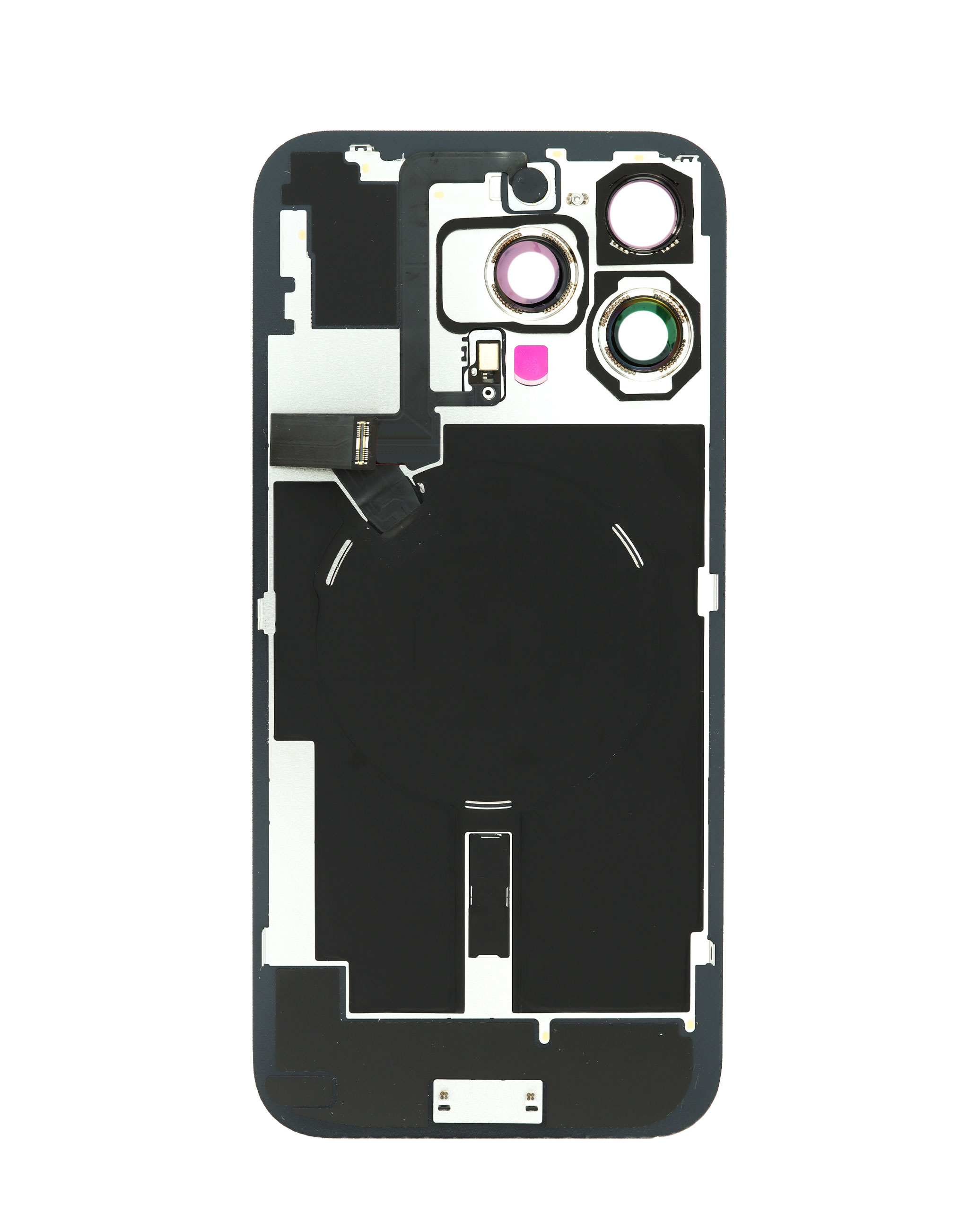 Stock up on the midnight OEM pull B grade back glass with frame, wireless NFC charging flex, and MagSafe magnet for iPhone 14.
