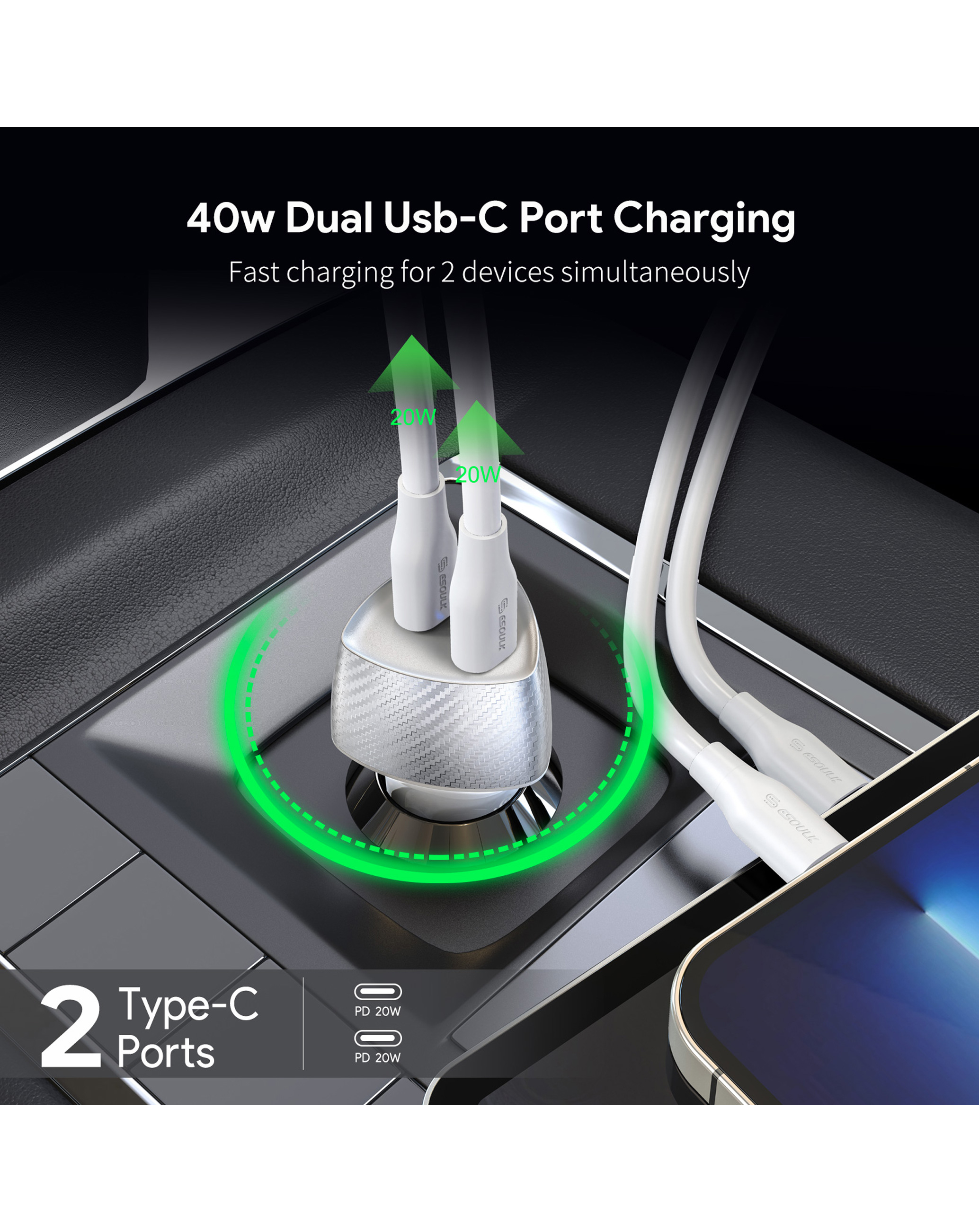 Esoulk Dual USB C+C Car Charger (WHITE) (40W) (Only Ground Shipping)