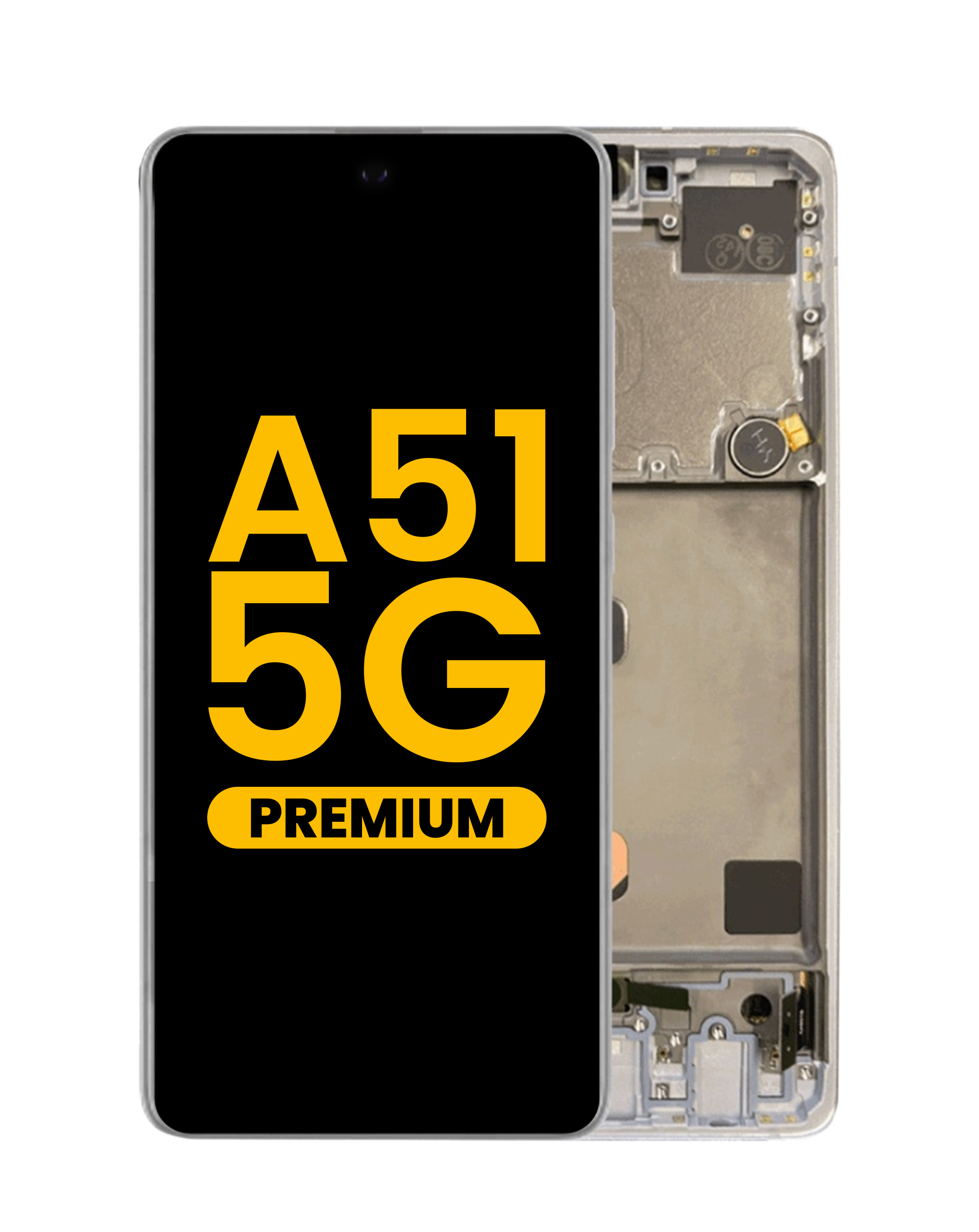 Grab the wholesale deals on the OLED Assembly with Frame in Prism Cube White, Premium, for Galaxy A51 5G, model A516 from 2020 – Non-Verizon.