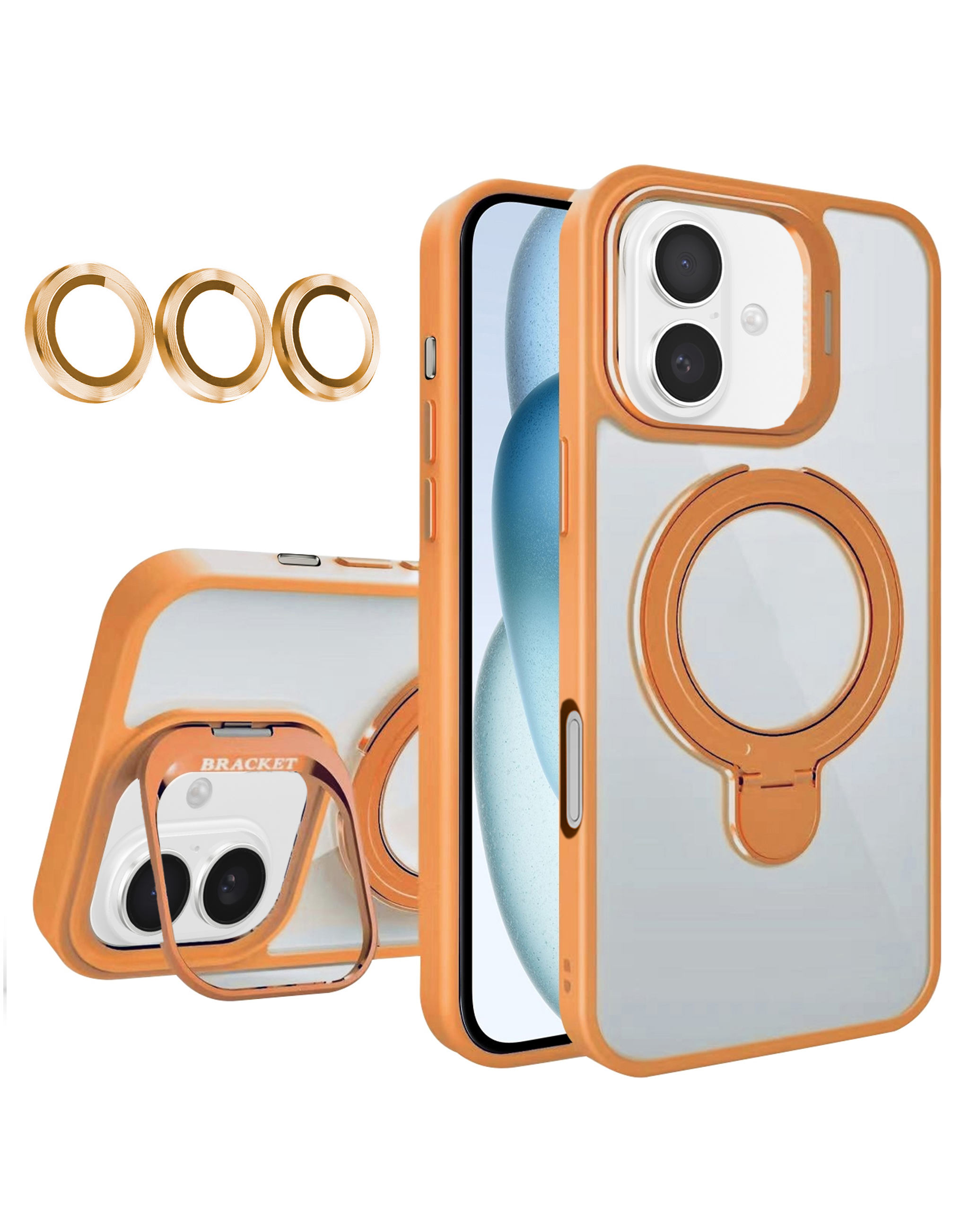 Magnetic Clear Case with 2 Kickstand & Camera Lens - ORANGE for iPhone 16 (Only Ground Shipping)