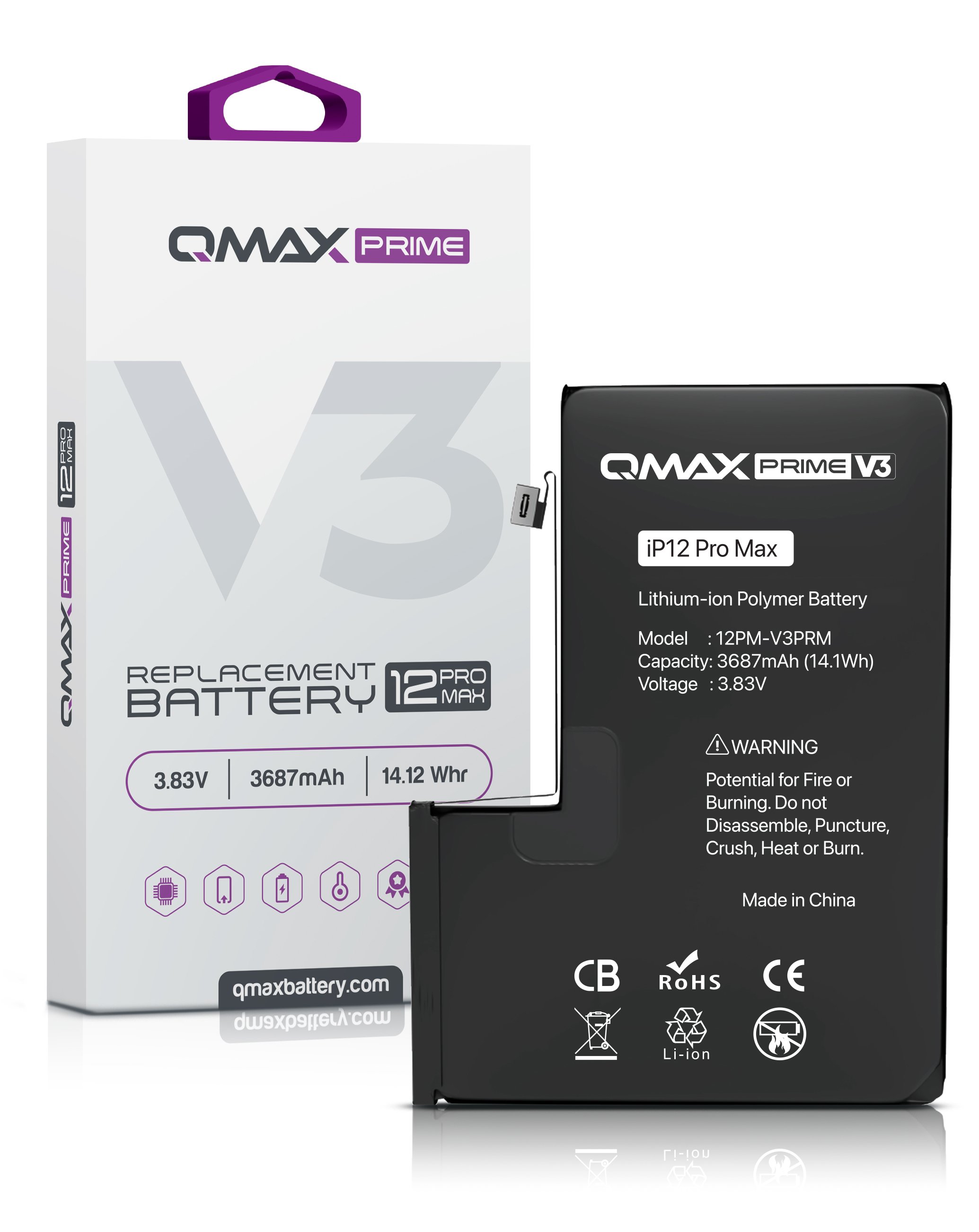 QMAX Prime V3 Replacement Battery for iPhone 12 Pro Max (No Pop-Up) (3687 mAh) (Only Ground Shipping)