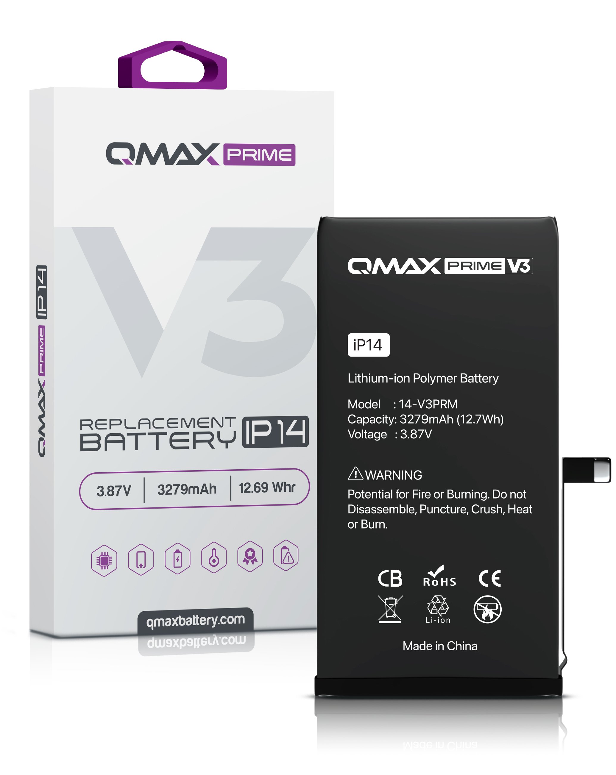 QMAX Prime V3 Replacement Battery for iPhone 14 (No Pop-Up) (3279 mAh) (Only Ground Shipping)