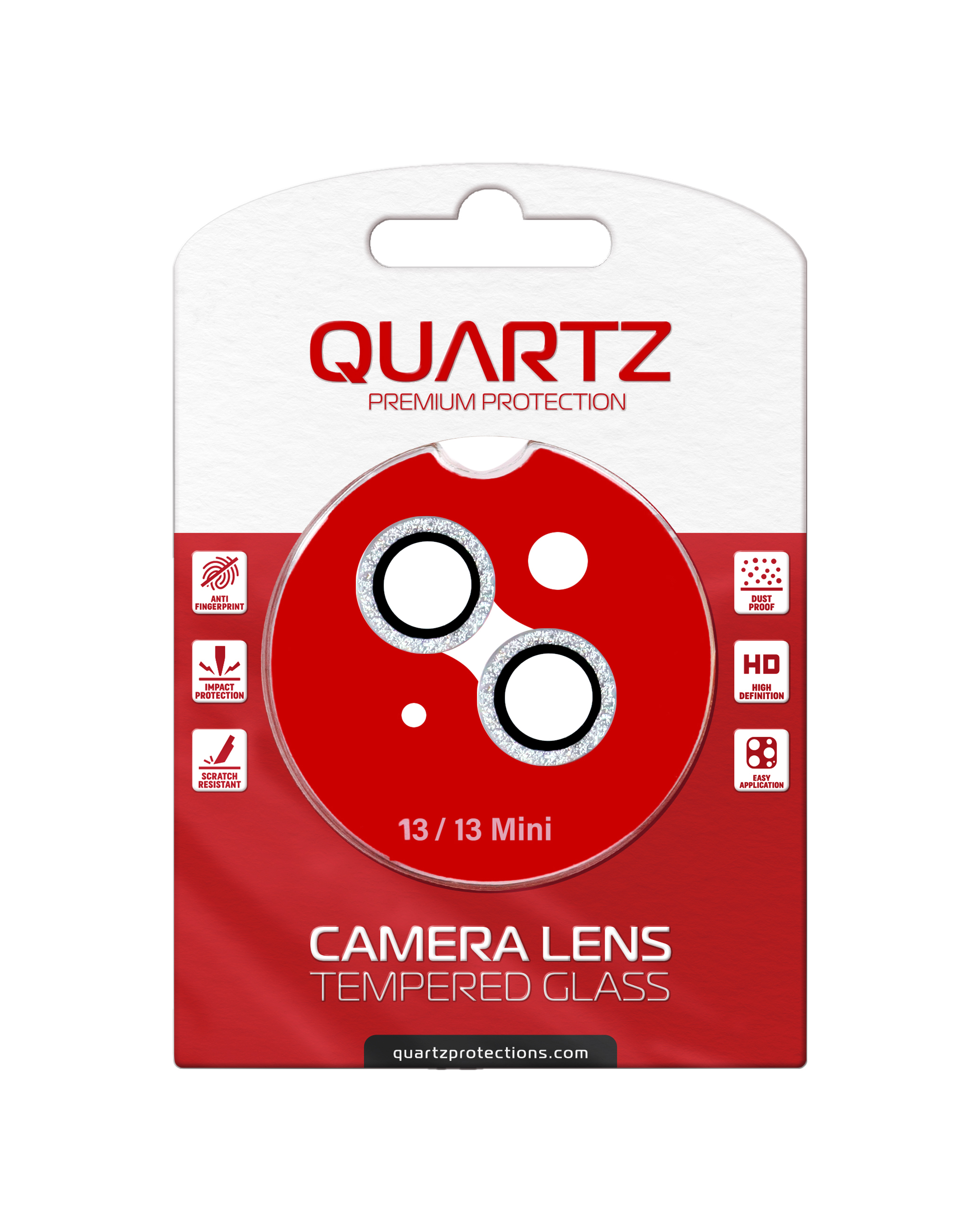 Product Color Badge Shop the Quartz HD Tempered Glass with Glitter Diamond Camera Lens for iPhone 13 and 13 Mini Back Camera in Red.