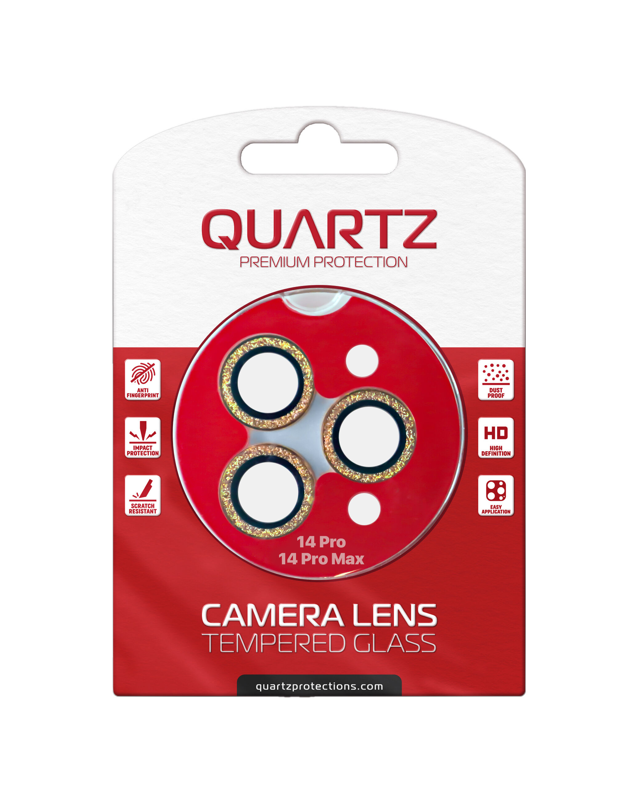 Grab the wholesale deals on the QUARTZ HD tempered glass in Gold with glitter diamond camera lens for the iPhone 14 Pro and 14 Pro Max back camera.