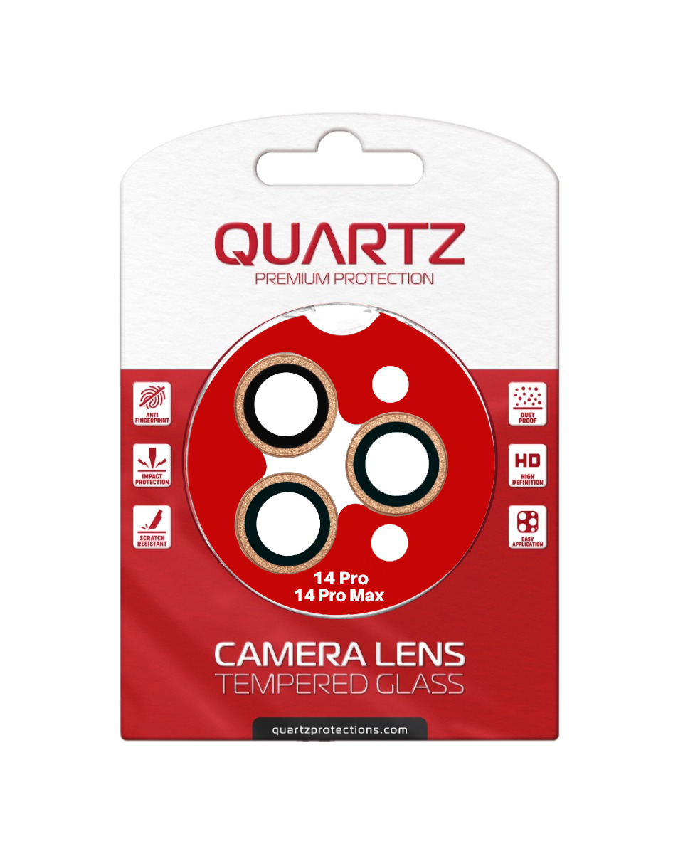 Buy the QUARTZ HD tempered glass with metal ring for the iPhone 14 Pro and 14 Pro Max back camera in Gold.