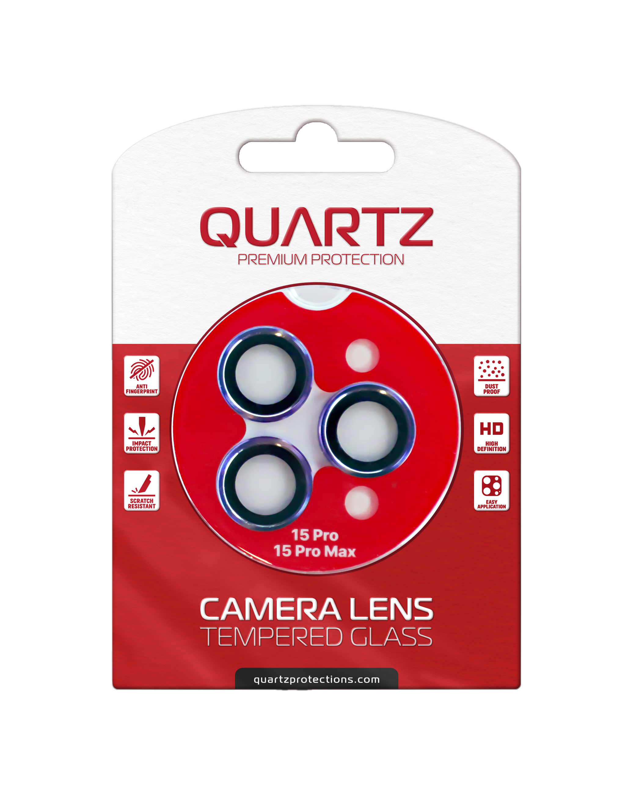 Product Color Badge Buy the QUARTZ HD Tempered Glass with Metal Ring for iPhone 15 Pro and 15 Pro Max Back Camera in red.